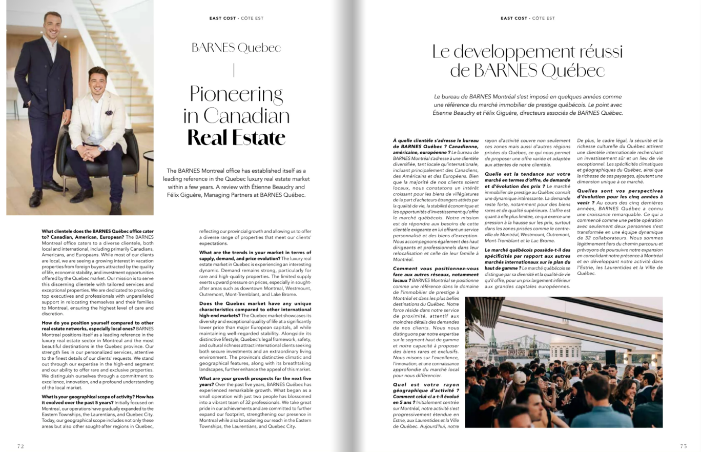 En parallèle, une entrevue exclusive avec nos associés directeurs de BARNES Québec, Étienne Beaudry et Félix Giguère, partage leur vision du marché, les tendances émergentes et l’essence de leur approche axée sur l’excellence et l’authenticité. Cette rencontre explore leur passion pour l’immobilier haut de gamme et leur attachement au Québec, une région riche en opportunités et en diversité architecturale.